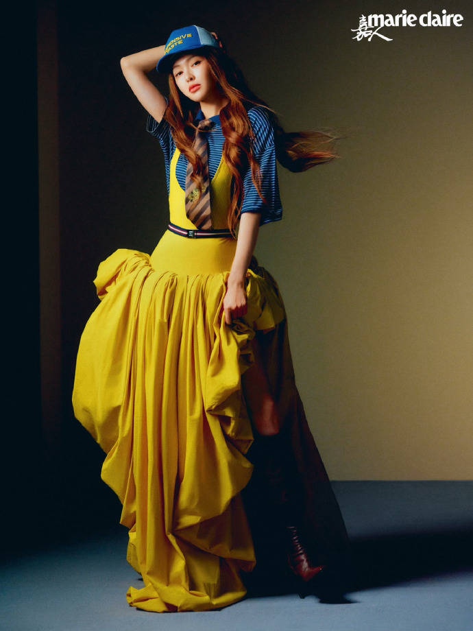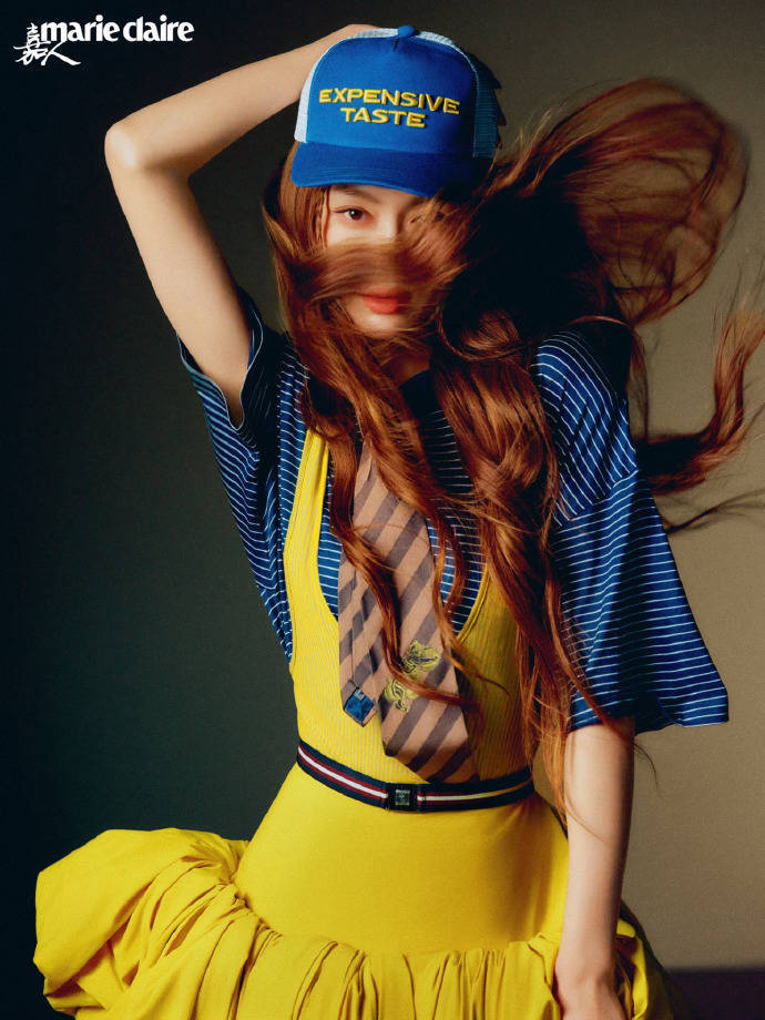 学院风的领带、条纹衫,带着青春的书卷气;街头感的棒球帽,注入随性不羁的活力;明黄色背心裙的廓形与垂坠感,又锚定了高级时装的质感。这种“冲突感的混搭”,恰恰证明了“无龄感”的核心:不被单一风格定义,而是用多元元素拼贴出属于自己的风格语法。